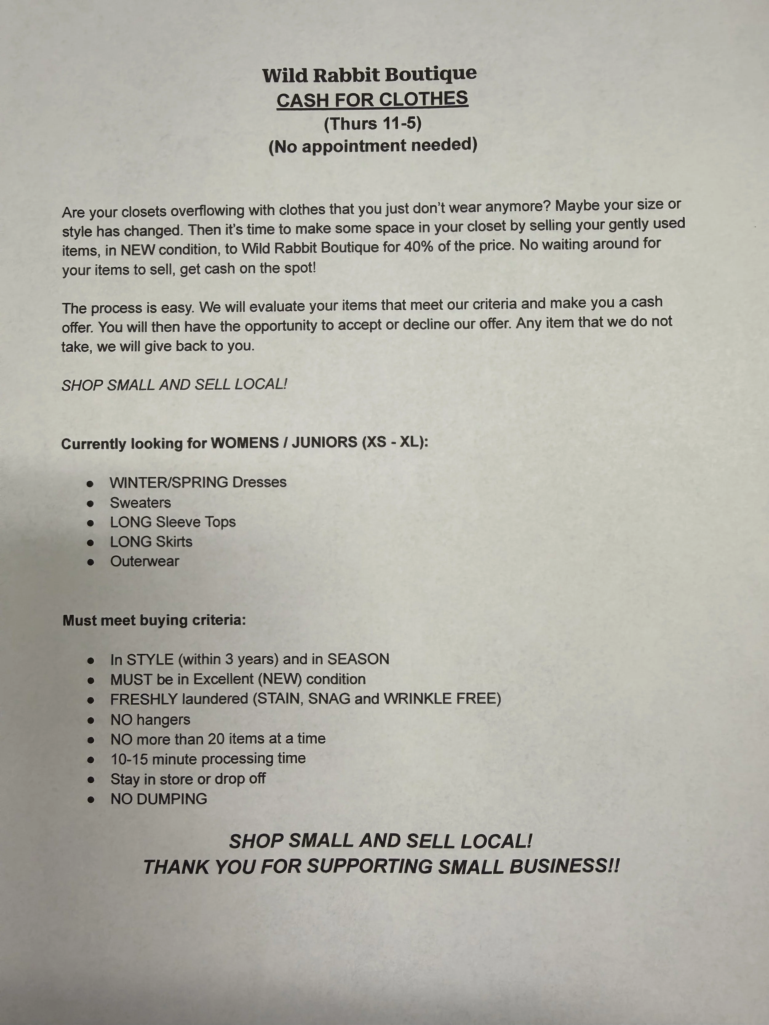 1. Announcement: We have RESTOCKED a ton of your favorite bath & body items! We will also be taking recycled clothing this month for Cash for Clothes. Please see CASH for CLOTHES requirements.