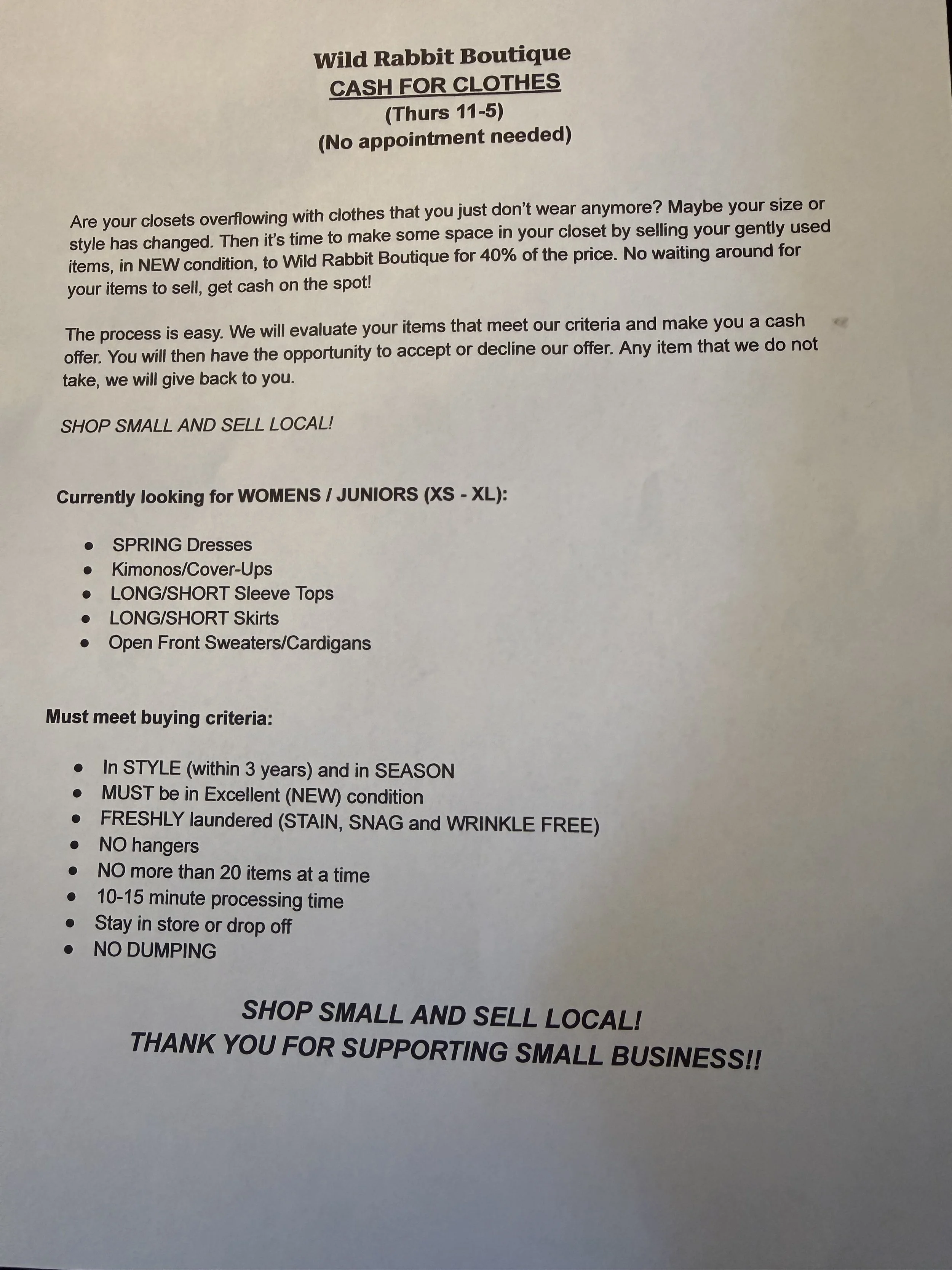 1. Announcement: New spring arrivals! We will also be taking recycled clothing this month for Cash for Clothes. Please see CASH for CLOTHES requirements.